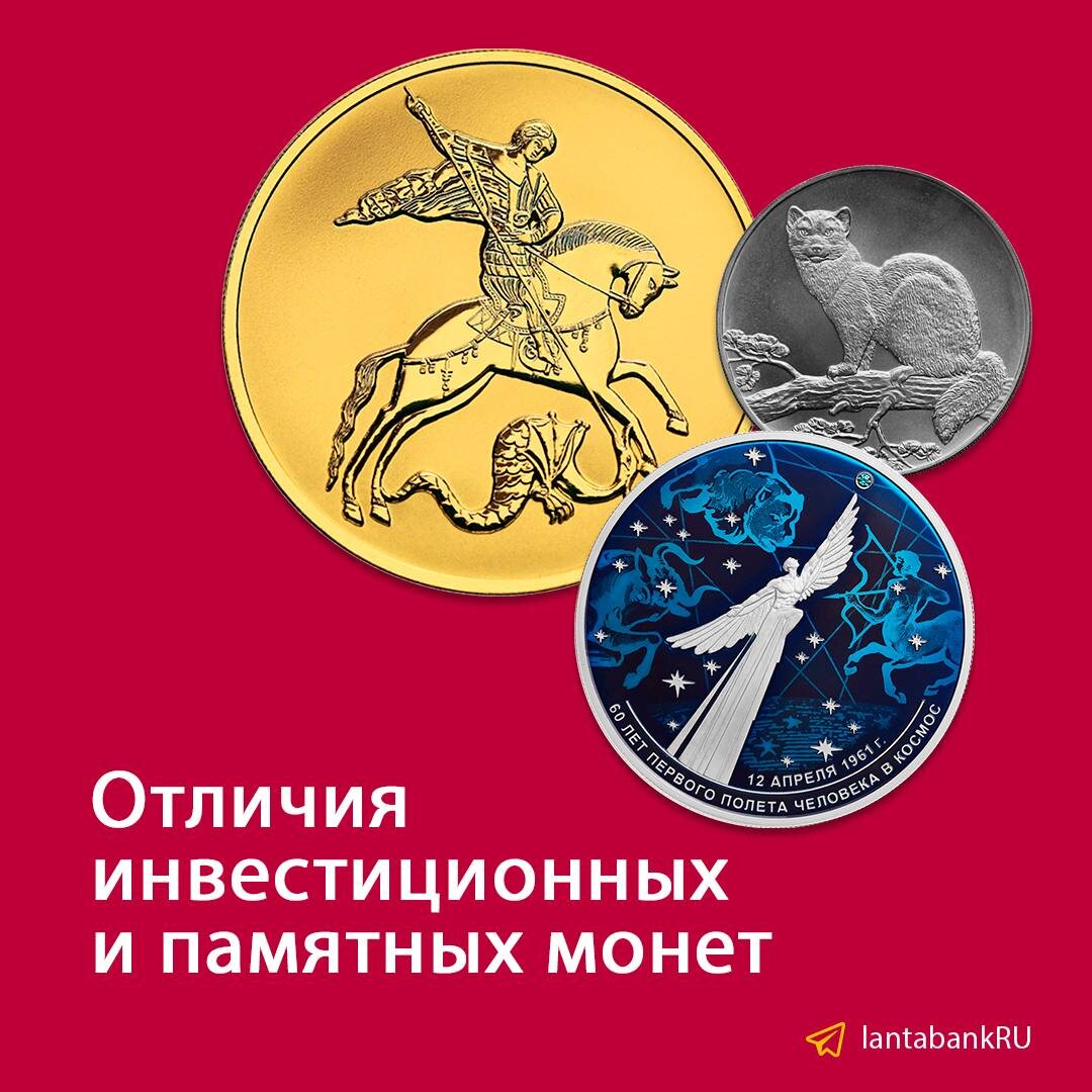 Главное отличие Для инвестиционных монет важна низкая наценка к стоимости содержащегося в них драгоценного металла. Для памятных - дизайн, редкость, тираж и сохранность. Инвестиционные монеты Изготавливаются исключительно из драгоценных металлов и должны строго соответствовать заявленным параметрам по весу и содержанию металла. Рисунок на реверсе обычно прост по дизайну. Чаще всего - это изображение предмета, животного, исторической личности, мифического персонажа и т.п., являющегося узнаваемым символом страны-эмитента. Памятные монеты Могут быть выполнены из драгоценных и недрагоценных металлов. Имеют коллекционное назначение и выпускаются в честь юбилеев и памятных дат, событий истории и современности, актуальных явлений культуры, политики, общественной жизни и т.п. Такие монеты нередко организуются в тематические серии. Рисунки на реверсах зачастую многоплановые и сложные по композиции. Для чеканки может применяться техника «reverse frosted», при которой на поверхности монеты форм