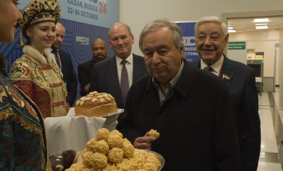 Генеральный секретарь ООН Антониу Гутерриш прибыл в ночь со вторника на среду в Казань для участия в саммите БРИКС. На кадрах политик отламывает кусочек каравая и с улыбкой пробует татарский национальный десерт чак-чак. Саммит глав государств — членов БРИКС проходит в Казани с 22 по 24 октября. Ожидается, что мероприятие посетят лидеры 22 стран, в том числе ближайшие соседи России, а также партнеры по Евразийскому экономическому союзу и Содружеству Независимых Государств. C 1 января 2024 года Россия председательствует в БРИКС. С начала года полноправными членами организации стали пять стран: Египет, Иран, ОАЭ, Саудовская Аравия и Эфиопия. По словам замглавы МИД РФ Сергея Рябкова, все форматы, в которых участвуют государства, не входящие в объединение, включены в общее определение «БРИКС плюс».