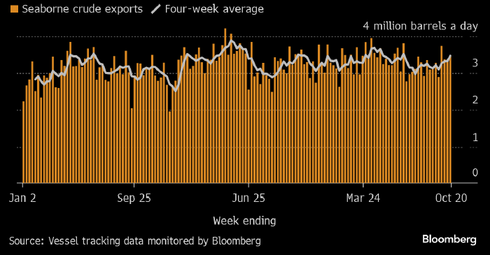 Его валовая стоимость поднялась до максимальных с августа $1,59 млрд в неделю. Оранжевым — морской экспорт нефти из России, серым — его среднее четырехнедельное значение в млн б/д. Данные и источник: Bloomberg Морской экспорт нефти из России растет уже четыре недели подряд, поднявшись до самого высокого уровня с конца июня. Это — следствие того, что сезонные ремонтные работы на НПЗ подталкивают объем нефтепереработки в стране к самому низкому уровню за два года с лишним. За неделю, завершившуюся 20 октября, средний четырехнедельный объем поставок вырос на 140 тыс. б/д до 3,47 млн б/д. Экспорт в Азию, включая партии, направляющиеся к Суэцкому каналу, которые, скорее всего, окажутся в Индии, достиг самого высокого уровня за пять месяцев с лишним. В этот регион направляется около 95% морского экспорта российской нефти, и почти вся она идет в Индию и Китай. За 28 дней до 20 октября валовая стоимость российского морского экспорта нефти выросла до $1,59 млрд в неделю по сравнению с $1,52 млр