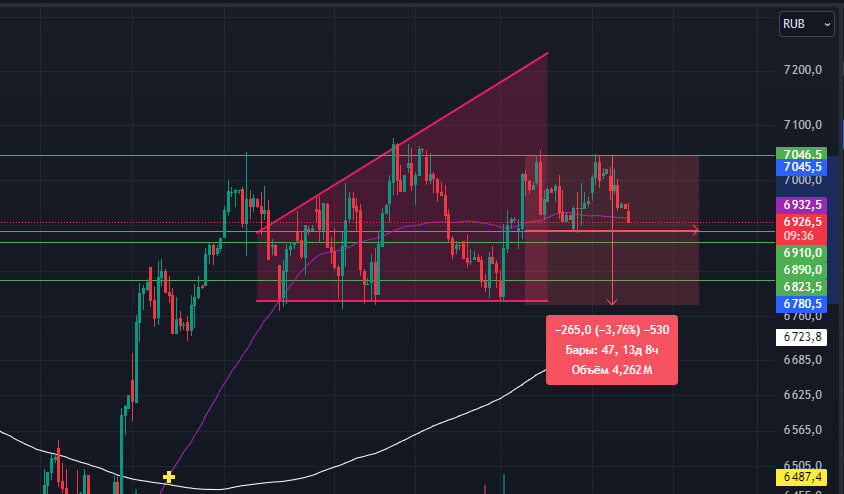 $LKOH⛽️ У Лукойла довольно много сигналов в шорт. Строит поджатие к уровню. 📉Поддержки 6780, как только пробьёт, пойдёт отрабатывать поджатие на понижение цены. ✔️В середине расширяющегося канала образовалась фигура двойная вершина - это фигура разворотная, он её уже отрабатывает. ✔️Отработка фигуры ровно до поддержки. 🔽Если подтвердит треугольник, то цена будет продолжать снижаться, Я предполагаю, что есть вероятность увидеть Лукойл по 6554,5. НЕ ИИР #теханализ #инвестиции #трейдер