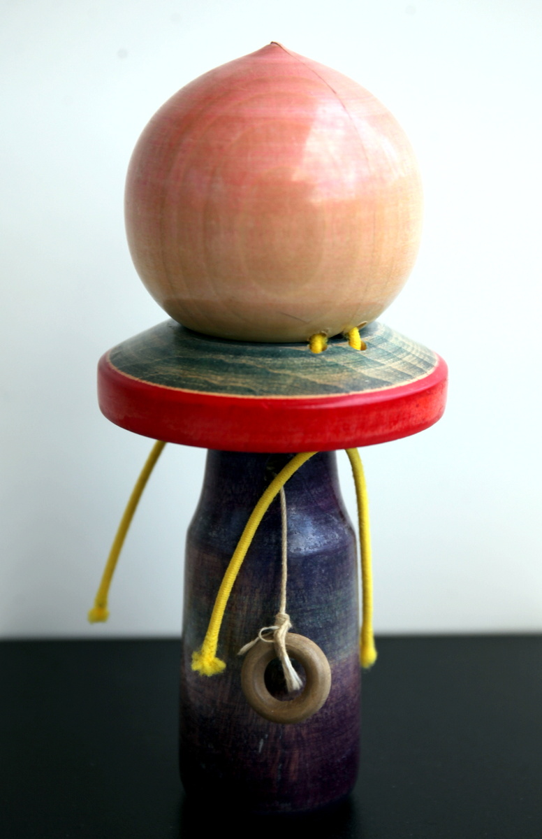 Волчок сделан мастером Хирои Масааки (1935-2019), примерно в 70-х годах 20-го века. Автор делал традиционные волчки и игрушки, которые были популярны в период Эдо (1603-1867), за свою жизнь он сделал больше 4000 тысяч различных игрушек. Многие из них – механизмы, которые приводятся в движение различными способами. Этот волчок крутиться, если потянуть за веревочку. Персик раскрывается, и мы видим изображение мальчика – героя одной из самых известных японских сказок «Момотаро», что переводится на русский язык, как «Мальчик-персик». Причем, «момо» по-японски это персик, а «таро» приставка, обозначающая первого или старшего сына в семье. В этой сказке старик со старухой, у которых не было детей, вымолили у богов ребенка, который явился им в огромном персике, а когда вырос победил демонов с острова Онигасима, избавил жителей побережья от их набегов и обеспечил своих старых родителей. Во время реставрации (оторвалась веревочка, за которую надо тянуть, чтобы раскрутить волчок) пришлось его р