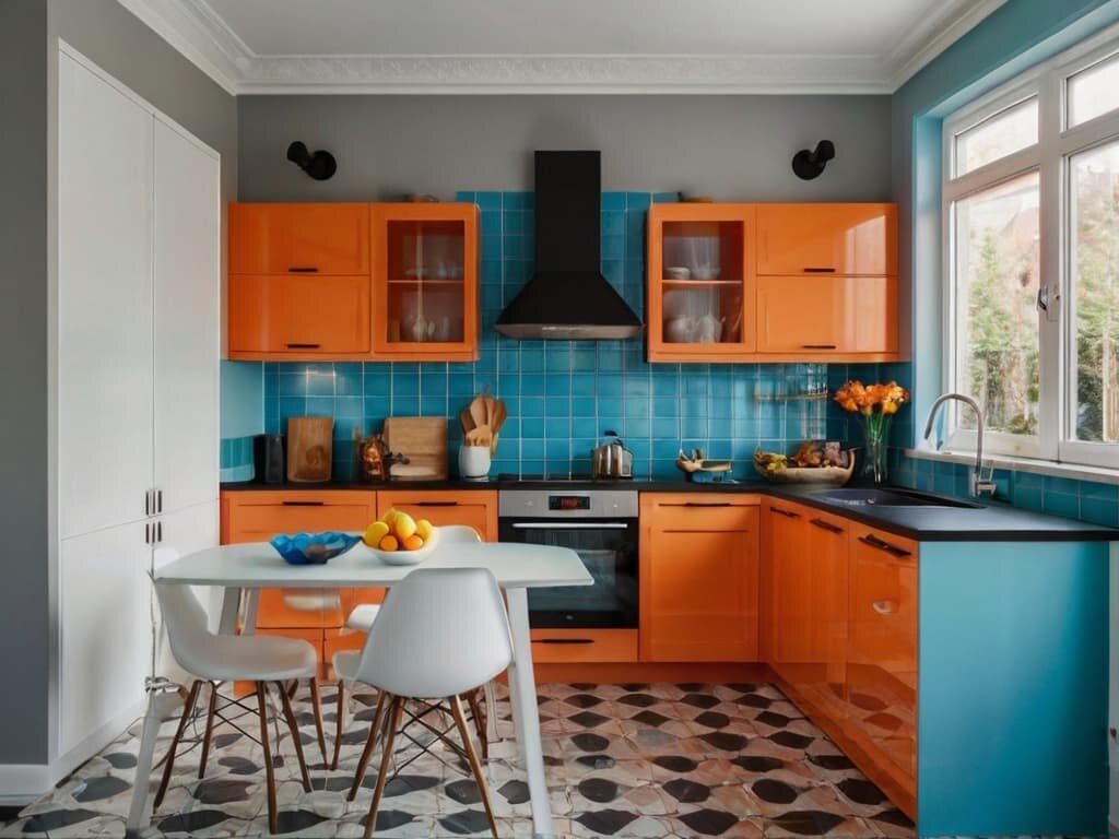 Оранжевые шкафы — смелое решение для тех, кто хочет добавить яркости и тепла в интерьер. Этот насыщенный цвет сразу привлекает внимание и создает позитивное настроение на кухне, делая ее центром домашней жизни.