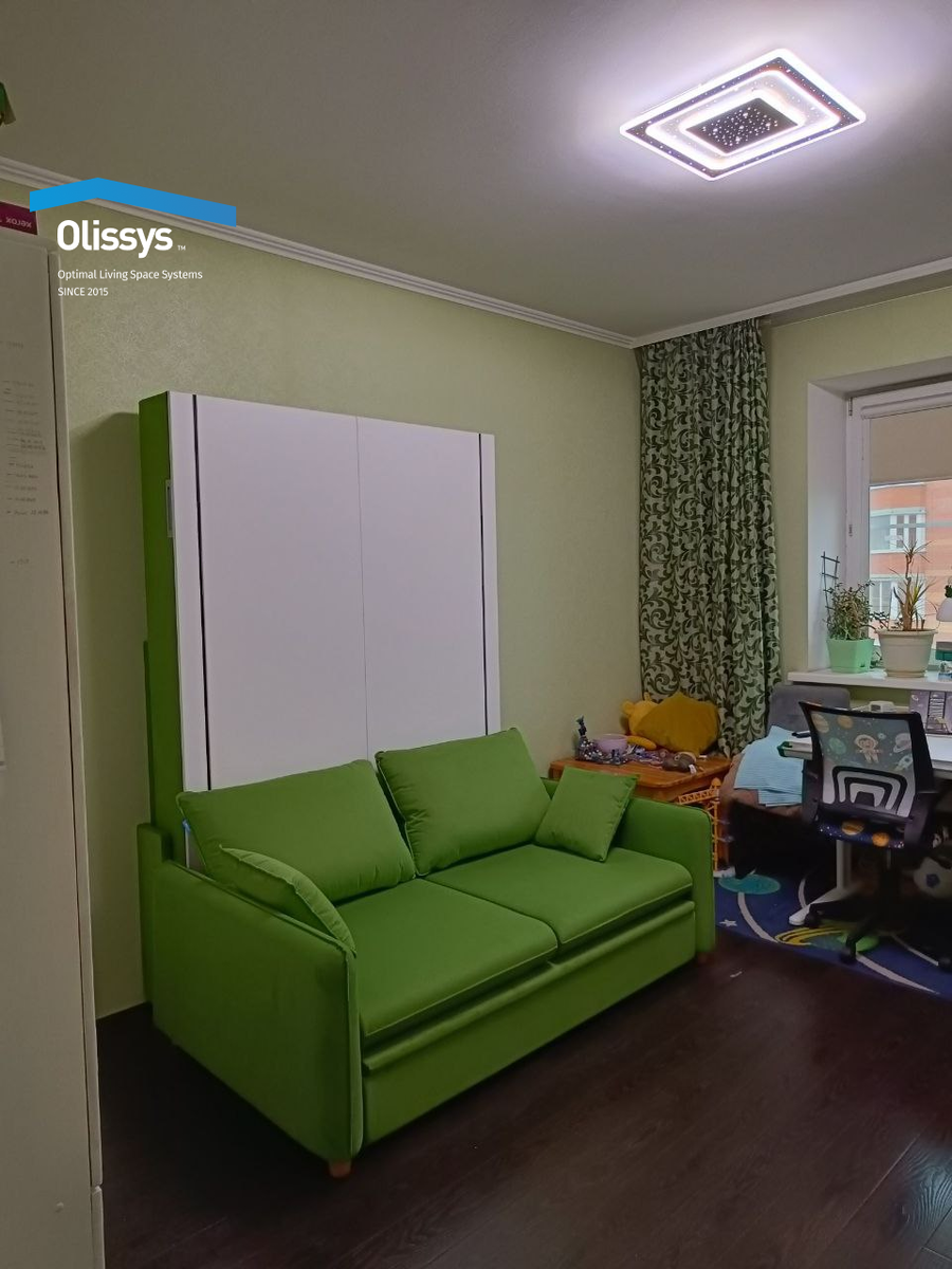 Наши заказчики сами создают свою мебель ❤️ Для этого у них есть все необходимое: - каталог изделий, чтобы выбрать нужную модель кровати-трансформера; - онлайн-конфигуратор, чтобы подобрать размер и наполнение изделия; - каталог фасадов и тканей, чтобы определиться с материалами. Особенно важен последний пункт, так как именно выбранные вами материалы создают весь интерьер, делают его уникальным и уютным 😉 Поэтому рекомендуем заглянуть в каталоги на сайте Olissys.com. Там вы найдете десятки вариантов на разный вкус, цвет, фактуру и бюджет. В сегодняшнем проекте наши заказчики сделали выбор в пользу модуля-трансформера Olissys 2.0 Classic с шириной спального места 140 см и ярко-зеленым диваном! 😍 Это мягчайший микровелюр из коллекции Maxima Velutto, оттенок 31. Из такой же ткани выполнен мягкий борт кровати, а также тканное изголовье. Особенно интересно материал смотрится на фоне бледно-зеленого оттенка стен. А еще наши заказчики выбрали в тон шторы! Получилось стильно и гармонично 👌 О
