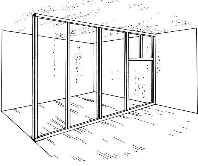 - Направляющие (ПН) профили устанавливаются на пол и потолок, а стоечные (ПС) профили — вертикально. Для жесткости расстояние между стоечными профилями должно быть не более 60 см.