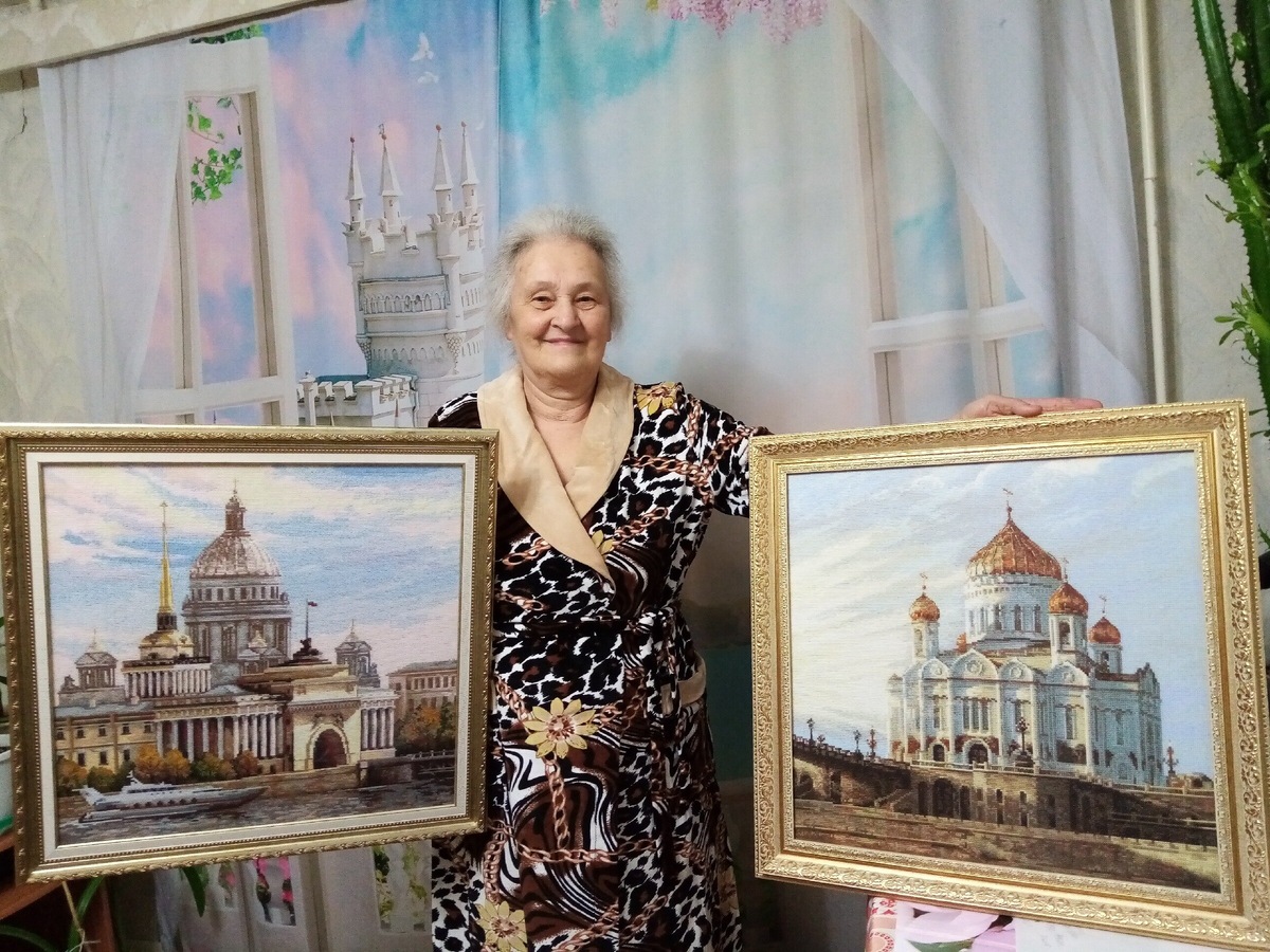 Вы знаете, что я люблю рукодельничать? Да, я люблю вышивать. Вышивка гладью мне почему-то не приглянулась . Больше всего я люблю вышивать крестиком. Сохранилась одна моя работа из детства "Анютины глазки". Много картин я стала вышивать, когда ушла на пенсию, и стало много свободного времени. Да и на пенсии ещё почти 12 лет отработала на моей любимой работе. После школы училась в Мышкинском сельхозтехникуме, специальность по диплому: бухгалтер-экономист-плановик. Нас учили по ускоренной программе 2 года 2 месяца, из них на практике были 9 месяцев. По окончании техникума я с трудом попала на место своей практики. Ну, а потом — работа, семья. Не до вышивания. Ушла с работы тогда, когда моё место потребовалось дочери моего начальника. Пришлось уступить, да и устала я уже. Ну, а так как я совсем не могу сидеть без дела, я сначала научилась вязать коврики. Навязала много ковриков, на даче на каждом стуле лежат. Сначала облагораживали купленный дачный дом: ремонтировали, отмывали, клеили, кра