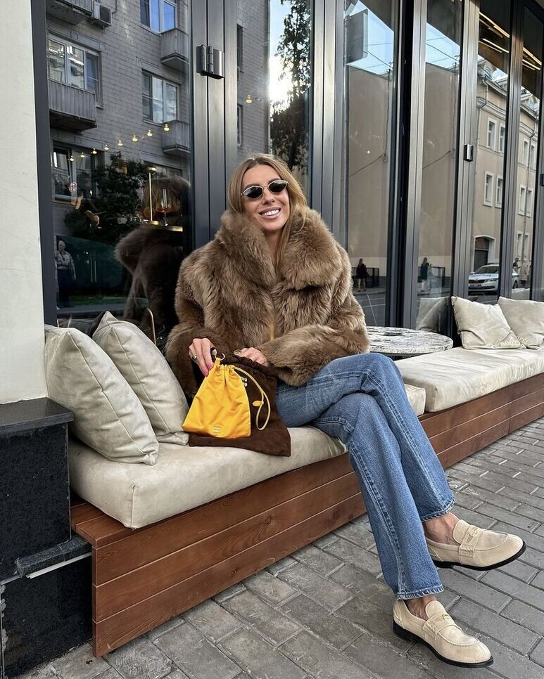 Светлана Бондарчук не перестает радовать подписчиков стильными образами! Она тонко чувствует последние тренды и гармонично вписывает их свой гардероб. За своей порцией вдохновения я пошла в социальные сети светской львицы. И нашла то, что искала! На днях Бондарчук поделилась серией фото, на которых позирует в образе, идеальном для поздней осени: приталенный кардиган в рубчик в трендовом сливочно-желтом оттенке, базовые джинсы прямого кроя, на высокой посадке, пушистая укороченная шубка светло-коричневого цвета и замшевые лоферы в тон. Кэжуал вещи подружились со статусными — сочетание выглядит гармонично. Особенно наше внимание привлекли джинсы. Светлана продемонстрировала отличную модель для тех, кому надоели безразмерные шаровары, а скинни не радуют глаз! Высокая посадка, в меру свободные брючины, которые не висят и не облегают, оптимальная длина — ниспадает на обувь, однако не волокутся по земле. Цвет отличный, базовый: классический голубой деним, в котором и в пир, и в мир можно. На