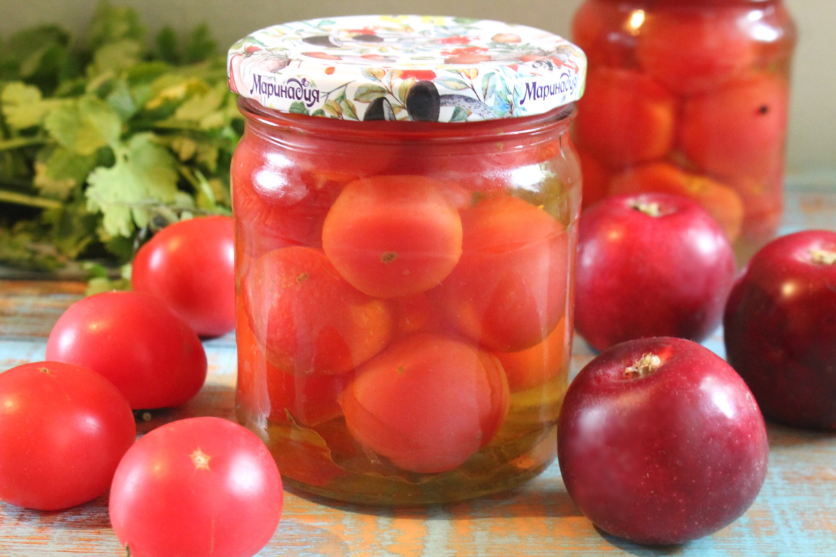 Недавно под одним рецептом добрый человек, читатель с ником "А" порекомендовал мне новый для меня рецепт маринованных помидоров. Мы договорились, что когда я их приготовлю, я расскажу свое мнение. Вообще это удивительно, что рецепт именно этих маринованных помидоров от меня ускользнул! Я ведь каждый год ищу и испробую хоть пару новых рецептов маринованных помидоров. Ирония такова, очень люблю из фруктов - яблоки, а из овощей - помидоры. И тут рецепт для меня, о котором я даже не знала! В итоге я заготовила помидоры в соке, одну баночку выдерживала и вот сегодня открыла на пробу. Отличные маринованные помидоры, вот просто великолепные! Спасибо за такую хорошую наводку читателю! Люблю обратную связь. Я буду теперь заготавливать и такие помидоры тоже. Помидоры - 0.5 кг. Сок яблочный без мякоти - 500 мл. Соль - 1 ст.л. Лавровый лист - 2 шт. Смесь перца горошка Уксус 70% - 0.3 ч.л. В банки разложим по одному лавровому листу и по 5-6 штук перца горошка разных цветов. Можно использовать тольк