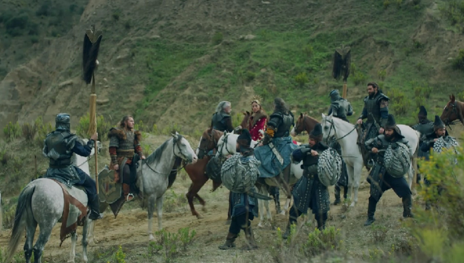 Караван Небесного хана приближаются к разграбленному каравану. Темур осмотрев место, находит оставшихся в живых воина и узнает, что на их караван напала Коготь двуглавого Волка. Темур обо всем докладывает отцу, а после приказывает Салтугу, найти безопасное место для хана и его семьи, а также осмотреть местность. Кая понимает, что здесь открытая местность и опасно на нем устанавливать шатер. Кая предлагает поставить шатер на холме за рекой.