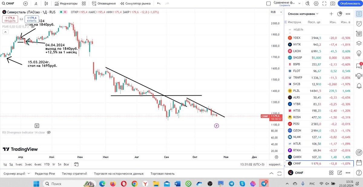 Манипуляция ли это ценой или такова жизнь всех металлургов после введения санкций, покажет время. Ранее мы говорили, что больше всего от санкций страдают именно сталевары. Вот страдают. В этой связи хотел бы предостеречь любителей покупать низкую базу. Исходя из характера движения цены за весь текущий год, у вас не было шанса сыграть даже на отскок. В общем, всё как мы обсуждали с подписчиками – сталелитейный сектор в 2024 году не лучшая инвестиция. Сегодня, 23.10.24 цена на обыкновенную акцию Северстали практически подошла к минимумам прошлого года, что дэ-факто ставит под сомнение всю годовую