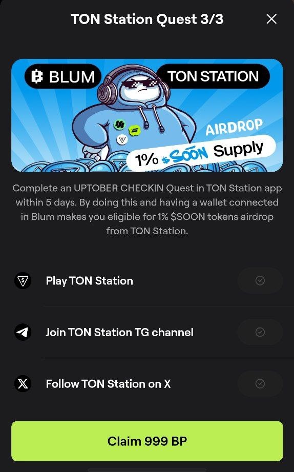 TON Station зарезервировала 1% от общего запаса SOON только для пользователей Blum. Какие есть награды и как получить квалификацию? 💸Награда ОДНА: 999 очков Blum Завершите квест TON Station в Blum. 💸Награда ВТОРАЯ: Выиграйте долю в будущей раздаче токенов SOON. Как квалифицироваться? Сделайте это в течение следующих 5 дней: Шаг 1: Подключите кошелек в Blum Шаг 2: Завершите квест TON Station: https://t.me/BlumCryptoBot/app?startapp=ref_zGTXk19a7V🚀 Шаг 3: Завершите квест UPTOBER CHECK-IN на станции TON ➕ Blum запустит Airdrop после SOON TGE и проверки участников. Чего вы ждете? Начните! О станции TON❤️ TON Station — это платформа для распространения игр премиум-класса. Эксклюзивные раздачи, премиум-контент для игр, эпическое сообщество и многое другое. В основе — собственный токен SOON — ваш шлюз в Web3 завтрашнего дня. 👍 Залетаем в BLUM - https://t.me/BlumCryptoBot/app?startapp=ref_zGTXk19a7V
