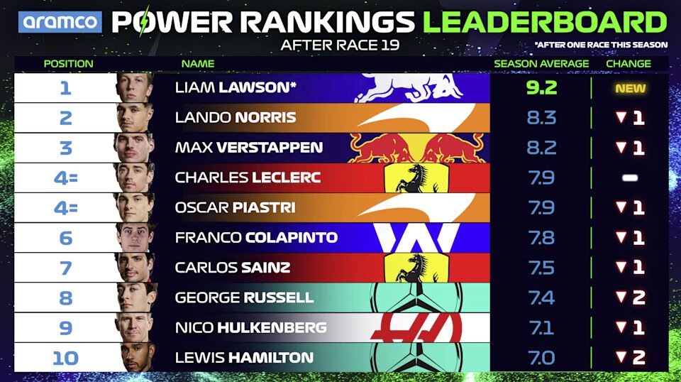 Эксперты сайта «Ф-1» назвали лучших гонщиков Гран-при США. По итогам каждого гоночного уик-энда пять экспертов официального сайта «Формулы-1» выставляют всем гонщикам оценки по 10-балльной шкале. Итоговой оценкой каждого пилота становится среднее получившееся значение. За этап в Остине наиболее высокую среди всех участников оценку получил выигравший гонку Шарль Леклер («Феррари») – 9,4 балла. Второе место в рейтинге занял пилот «РБ» Лиам Лоусон – он получил 9,2 балла. Третье место досталось напарнику Леклера по «Феррари» Карлосу Сайнсу – 9,0 балла. Рейтинг пилотов на Гран-при США по версии экспертов сайта «Ф-1» 1. Шарль Леклер («Феррари») – 9,4 2. Лиам Лоусон («РБ») – 9,2 3. Карлос Сайнс («Феррари») – 9,0 4. Макс Ферстаппен («Ред Булл») – 8,2 5. Ландо Норрис («Макларен») – 8,0 6. Нико Хюлькенберг («Хаас») – 6,0 6. Франко Колапинто («Уильямс») – 6,0 8. Пьер Гасли («Альпин») – 7,4 8. Кевин Магнуссен («Хаас») – 7,4 10. Джордж Расселл («Мерседес») – 6,8 В общем зачете рейтинга на первое ме