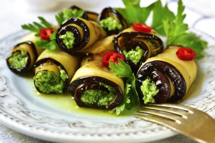Рулетики из баклажанов с песто — это популярное блюдо средиземноморской кухни, которое отличается ярким вкусом и ароматом. Баклажаны, приготовленные таким образом, получаются нежными внутри и хрустящими снаружи. Песто, в свою очередь, добавляет блюду пикантные нотки. Для приготовления рулетиков из баклажанов с песто вам понадобятся: Приготовление: Баклажаны нарежьте вдоль на длинные полоски толщиной около 5 мм. Посыпьте солью и оставьте на 10–15 минут, чтобы баклажаны выпустили горечь. Затем промойте их под холодной водой и обсушите бумажными полотенцами. Разогрейте духовку до 200 градусов. Выложите баклажаны на противень, застеленный пергаментной бумагой, и сбрызните оливковым маслом. Запекайте баклажаны в духовке в течение 15–20 минут, до мягкости. Готовые баклажаны выложите на рабочую поверхность и дайте им немного остыть. На каждый ломтик баклажана нанесите соус песто, затем выложите на него небольшие кусочки моцареллы. Сверните баклажаны в рулетики и выложите на блюдо. Рулетики из
