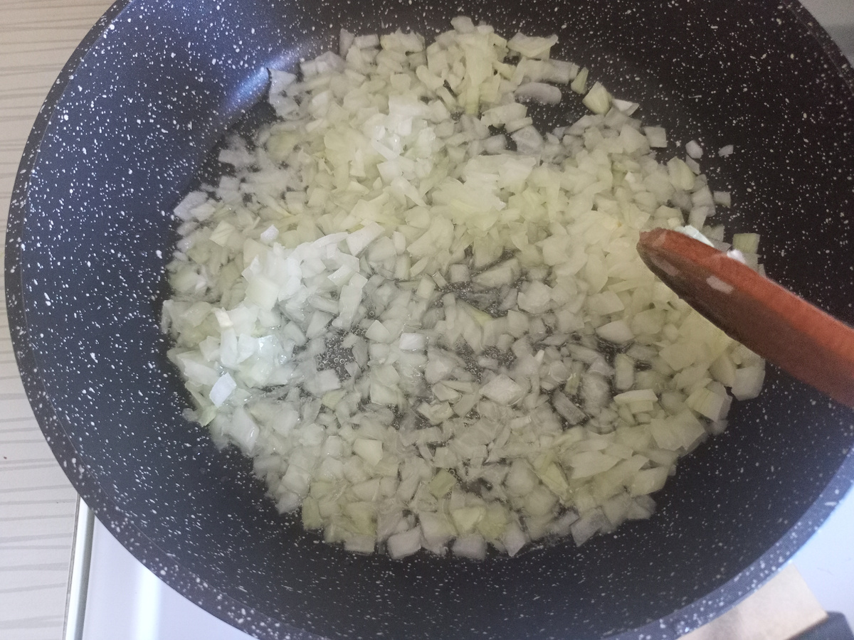 - Лук мелко нарезать и обжарить до золотистого цвета