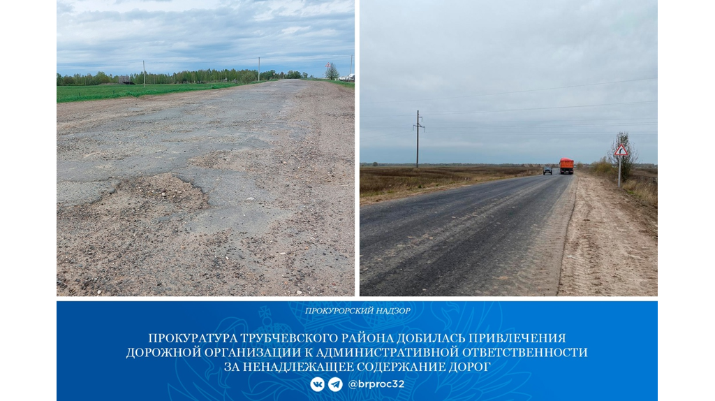 В Трубчевском районе прокуратура совместно с сотрудниками ГИБДД выявила нарушения законодательства о безопасности дорожного движения. На участке дороги «Семцы - Рамасуха - Трубчевск - Петровское» имеются многочисленные ямы и выбоины. Верхние слои асфальта полностью изношены. Надзорное ведомство подало иск в суд. «Управление автомобильных дорог Брянской области» привлечено к административной ответственности. Организации выписали штраф в размере 100 тысяч рублей. Управление обжаловало решение в вышестоящем суде. Однако, его апелляция была отклонена. После вмешательства прокуратуры участок дороги отремонтировали. В Трубчевском районе после вмешательства прокуратуры отремонтировали убитую дорогу
