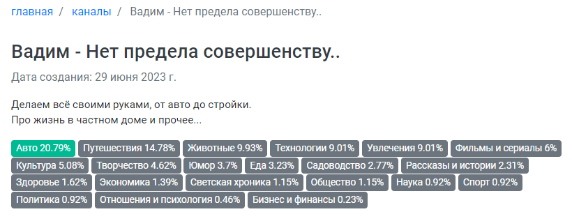 Когда я создавал канал, в нем не было , да и сейчас нет строгой тематики. Гуру говорили так нельзя, алгоритмы не смогут определить тематику канала, а значит и рекомендовать не будут читателям. Наверное они были правы, так как канал слабо развивается. Периодически смотрю статистику канала на сервисе зенстат и как то раньше распределение тем на моем канале было маловато. А тут зашел на днях и видим , что алгоритм справился, вот уже распределение моего канала по темам. Больше года понадобилось алгоритму на такое распределение тематик канала. Но, даже это уже не помогает. Слабоват прирост Вот такое кино...