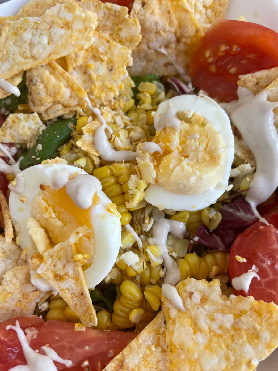 Иногда просто нет времени и желания готовить что-то сложносочиненное, тогда на помощь приходят они - салатики. Всегда стараюсь сделать их максимально полезными, чтобы и белки, и жиры, и углеводы. Предлагаю и вам попробовать полезный и питательный салат с легким мексиканским флером) На одну порцию берем: 40 гр салатного микса 150 гр помидоров 150 гр кукурузы (у меня была свежесвареная, но можно думаю и консервированную) 1 вареное яйцо Соус у меня был «Цезарь» по вкусу 20 гр начос, сухариков или криспов Процесс прост: все порезать, смешать , добавить соус и начос в конце, чтобы они остались хрустящими. Можно наслаждаться))