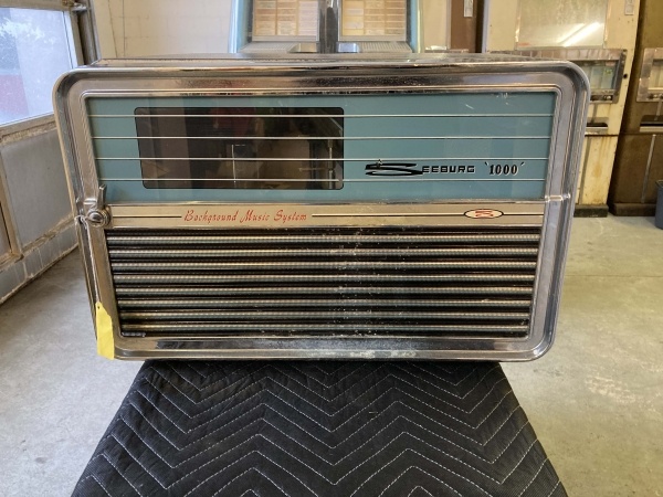 В 1959 году фирма Seeburg - известный производитель джукбоксов - представила аппарат для включения фоновой музыки - модель BMS 1000. Расшифровывается она как Background Music System, а цифра 1000 обозначала количество песен. Как это было возможно? Всё дело было в специальных пластинках со скоростью 16 2/3 оборота. Это позволило на небольшом диске диаметром 23 см записать порядка 20 песен одной стороне (или 40 минут музыки). Плотность составляла 420 канавок на дюйм. А сам аппарат позволял установить до 25 дисков и проигрывать их без остановки - так в сумме выходила 1000 песен.