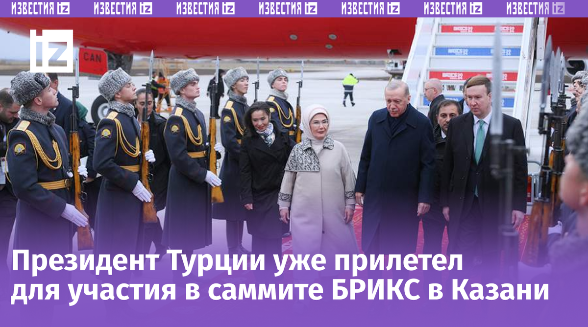 Президент Турции Реджеп Тайип Эрдоган прибыл в Казань для участия в работе саммита БРИКС. Самолет турецкого лидера приземлился около 14:45 мск. В аэропорту его с женой Эмине встретил глава Татарстана Рустам Минниханов, который вручил супруге президента Турции букет цветов. У трапа их также угостили караваем и чак-чаком. Свой визит в Казань Эрдоган начал во встречи с президентом Венесуэлы Николасом Мадуро. Саммит БРИКС в Казани проходит с 22 по 24 октября 2024 года. БРИКС — межгосударственное объединение стран. Последний саммит на уровне глав входящих в него государств прошел в Йоханнесбурге в августе 2023 года. По его итогам члены БРИКС приняли решение об историческом расширении. С 1 января 2024 года к Бразилии, России, Индии, Китаю и ЮАР присоединились Египет, Иран, Эфиопия и ОАЭ.