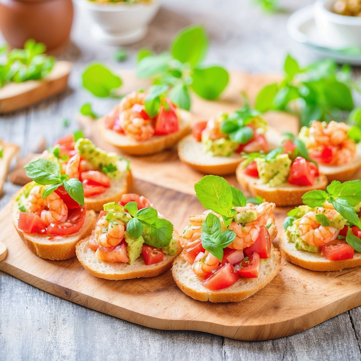 Ингредиенты: - Багет — 1 шт. - Авокадо — 1 шт. - Креветки — 200 г - Лимонный сок — 1 ст. л. - Оливковое масло — 2 ст. л. - Чеснок — 1 зубчик - Соль и перец — по вкусу - Свежий базилик для украшения Пошаговый рецепт: 1. Нарежьте багет на ломтики толщиной около 1 см. Слегка поджарьте их на сухой сковороде или в духовке до золотистой корочки. 2. В миске разомните авокадо вилкой, добавьте лимонный сок, соль и перец. Перемешайте до однородной массы. 3. Очистите креветки и обжарьте их на сковороде с оливковым маслом и измельченным чесноком в течение 3-4 минут. 4. Намажьте авокадо на поджаренные ломтики багета, сверху выложите креветки. 5. Украсьте листьями свежего базилика и подавайте.