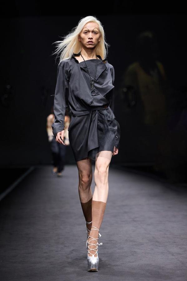 Узнайте, как Vivienne Westwood объединил панк, классику и авангард в дерзком шоу на Шанхайской неделе моды 2024. Панковские мотивы Показ открылся строгим костюмом в полоску, дополненным серебристыми туфлями на каблуке, что сразу задало тон всей коллекции. В пресс-релизе бренд утверждал: «Чёрный — лучший цвет для лета», тем самым подчёркивая свой антиконформистский подход. Vivienne Westwood продолжает размывать границы между мужским и женским стилем, представляя гендерно-нейтральные образы. Бренд оставил верность своему ДНК, включив элементы субверсивности и панк-эстетики. Практичность и повседневные образы Коллекция удивляла сочетанием повседневной одежды с более провокационными элементами. На подиуме появились футболки, мини-юбки, джинсовые куртки и свитеры. Не обошлось и без athleisure: байкерские шорты, купальники, майки и широкие джоггеры задали спортивный тон. Среди неожиданных элементов выделялась куртка в стиле Мао, вносящая политический подтекст и подчеркивающая эклектичность