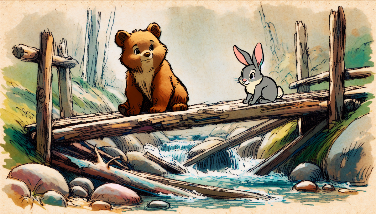 В волшебном лесу, полном красоты и гармонии, жили три верных друга: любознательный медвежонок Миша, умная лиса Рита и энергичный заяц Тим. Каждый день они наслаждались увлекательными приключениями, помогая обитателям леса и исследуя его неизведанные уголки. Однажды медвежонок Миша обратил внимание на деревянный мост через речку, который уже не выглядел так же, как раньше. Доски были потрескавшимися, а некоторые из них отсутствовали вовсе. — Ребята! — воскликнул он и поспешил к своим друзьям. — Посмотрите на мост! Он совсем старый и, кажется, вот-вот развалится! Лиса Рита, всегда интересовавшаяся устройством вещей, подошла к Мише и позвала с собой зайца Тима. Она сразу поняла, что мост необходимо отремонтировать, иначе животным станет трудно переходить через речку. Когда друзья подошли к мосту, они заметили, что он покачивается и трещит. — Ой, это же так опасно! — испуганно воскликнул заяц Тим.. — Если кто-то попытается перейти по этому мосту, он может рухнуть! Миша, Рита и Тим переглян