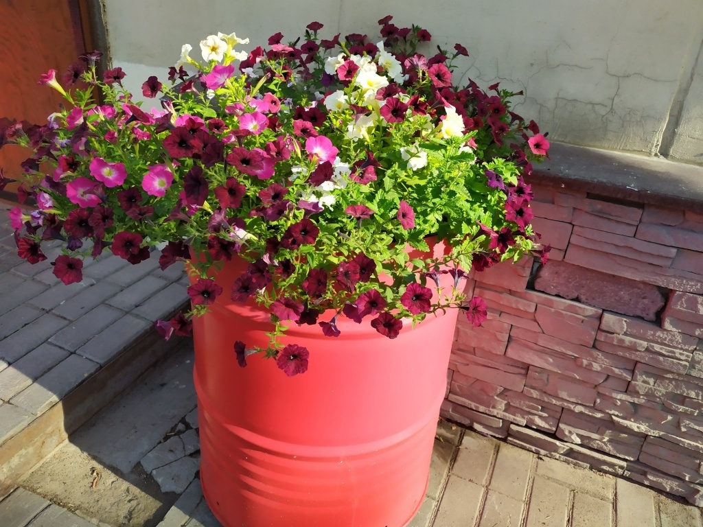 Из бочки, разрезанной продольно можно устроить настоящие клумбы. Выращивать в бочках можно любые цветы. В них прекрасно будут смотреться каскады петуний и сурфиний, брахикома и лобелия, композиции из разных летников и комнатных растений, или пейзаж из очитков и молодил.