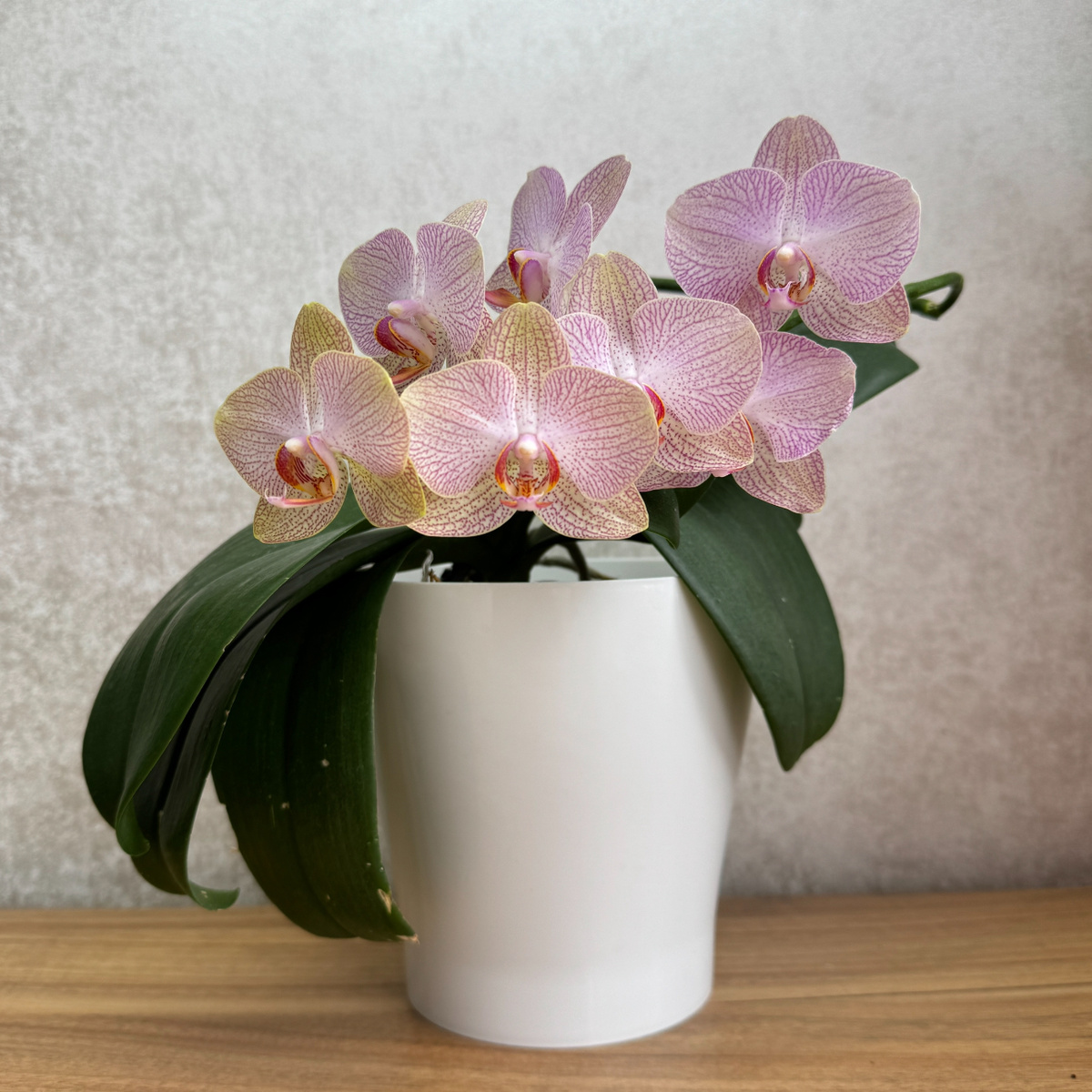 все фото к данной рубрике сделаны автором Кубай М. С. Стандарт, и классика садовых центров и масс маркетов. Совершенно простой сорт, но который стоит внимания особенно новичков. Красивый, нежный рисунок лепестков. Благодарное, сильное растение. Плотные темно зеленые листья. Данный гибрид с белыми или кремово—желтыми лепестками с оранжевыми или малиновыми прожилками (зависит от времени цветения) прожилки создают сеточку, губа яркая. В центре у колонки наблюдается высветление до белого. Данные фотографии летнего цветения, оно более блеклое, более нежное. Зимой как раз вы сможете увидеть оранжевый густой цвет. Сам цветок d- 7 см. Дома больше 10 цветочков еще не растил. Но и 10 смотрятся приличным, аккуратно сложенным букетом💐 мне нравится формировать цветонос данного гибрида «в закрутку» куст выглядит компактно мы то же время пышно. #цветениеорхидей #фаленопсисравелло #фаленопсис #уходорхидеи #поливорхидей #распознатьсорторхидей