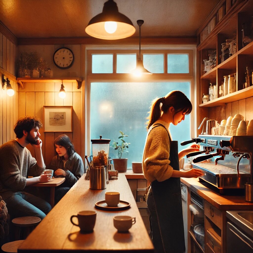 Дождливым осенним вечером в маленькой кофейне, спрятанной между старыми домами провинциального города, за кассой стояла Марина. Ее руки ловко двигались, готовя капучино, латте и эспрессо для редких гостей, что забегали сюда, спасаясь от моросящего дождя. Ее пальцы танцевали над кофемашиной, с легкостью создавая идеальную пенку и вырисовывая на ней крохотные сердечки. В тот вечер в кофейню вошел Никита - новый посетитель, который оказался непривычно молчаливым и даже слегка растерянным. Он заказал эспрессо и сел за столик в углу, откуда хорошо было видно Марину. В каждом ее движении была небывалая легкость и даже магия. Он невольно залюбовался тем, как ее руки, движимые какой-то внутренней мелодией, не варили, а создавали кофе, как создают произведения искусства. Марина заметила его взгляд и чуть смущенно улыбнулась в ответ. Она привыкла к заинтересованным взглядам гостей, но в его было что-то другое - не просто любопытство, а интерес с какой-то особенной теплотой. - Вы всегда так делае