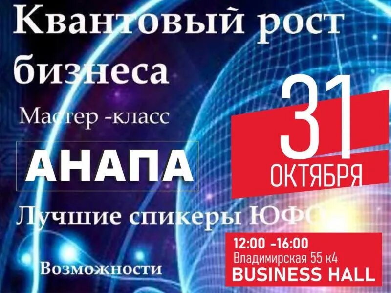 В Анапе 31 октября состоится выездной мастер-класс "Квантовый Рост Бизнеса", организованный комитетом по PR и связям со СМИ "ОПОРЫ РОССИИ". Мероприятие стартует в 12:00, в "BUSINESS HALL" по адресу: ул. Владимирская, 55, к4 (2 этаж). Как рассказала председатель комитета по PR и связям со СМИ «ОПОРЫ РОССИИ» Элеонора Глушкова, участники получат практические инструменты для развития своего бизнеса и ознакомятся с передовыми технологиями и трендами. Она уточнила, что «Квантовый Рост Бизнеса» — это уникальная возможность для предпринимателей Анапы услышать актуальную информацию от лучших бизнес-экспертов Кубани и Юга России, получить практические инструменты и узнать о новинках в сфере бизнеса. В программе мастер-класса: Мастер-класс проходит при поддержке Анапского отделения «ОПОРЫ РОССИИ» и Фонда Микрофинансирования Краснодарского края. Количество мест на мероприятия ограничено! Регистрация обязательна. Портал ЯСНО выступает информационным спонсором мероприятия.