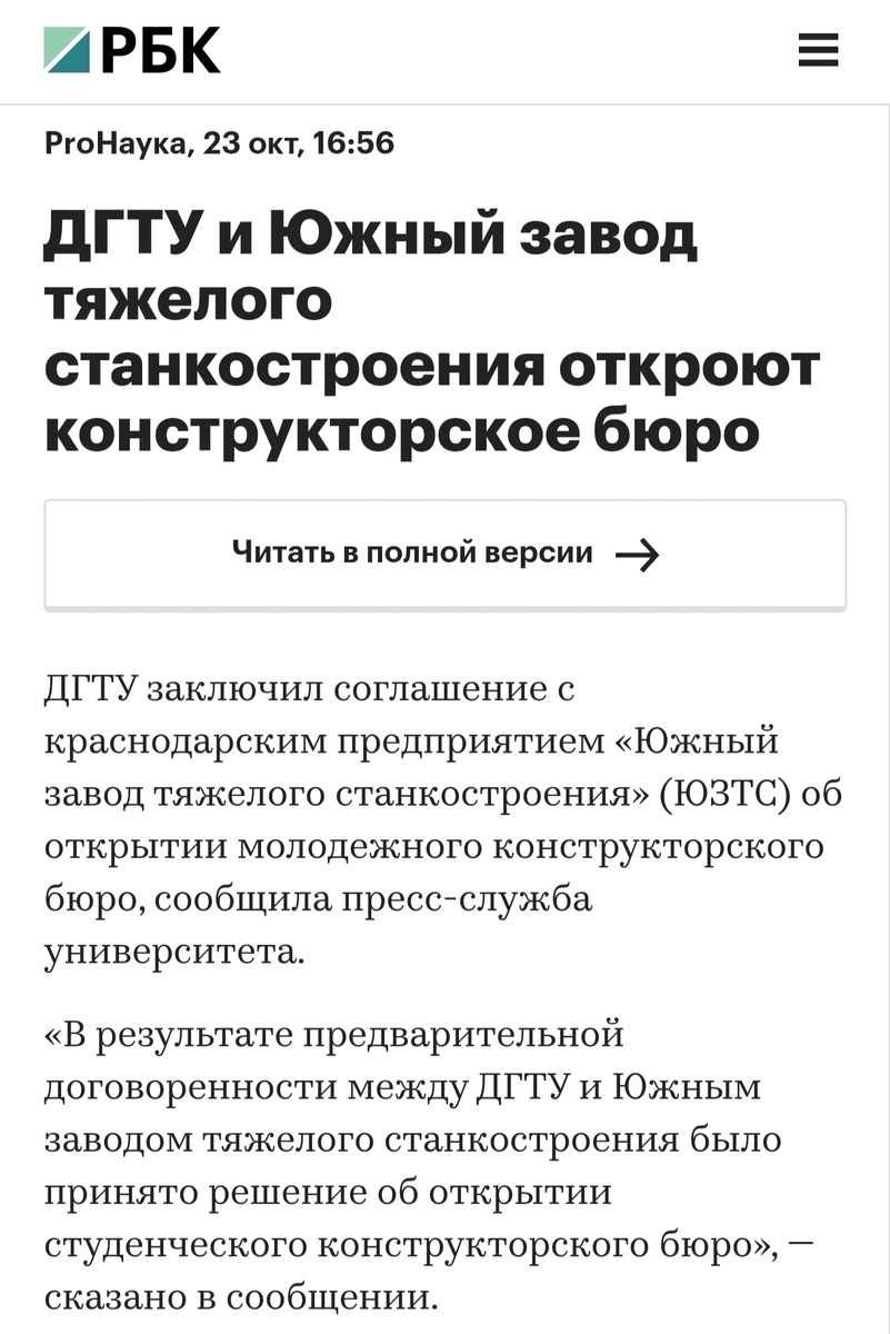 ДГТУ заключил соглашение с краснодарским предприятием «Южный завод тяжелого станкостроения» (ЮЗТС) об открытии молодежного конструкторского бюро, сообщила пресс-служба университета. «В результате предварительной договоренности между ДГТУ и Южным заводом тяжелого станкостроения было принято решение об открытии студенческого конструкторского бюро», — сказано в сообщении. Отмечается, что бюро даст студентам возможность поучаствовать в разработке реальных инженерных проектов. «Южный завод тяжелого станкостроения» основан в 2016 году на базе завода им. Седина в Краснодаре. Специализация предприятия — проектирование, производство и установка токарно-карусельных станков, многофункциональных обрабатывающих центров и продольно-фрезерных станков, используемых в разных отраслях промышленности. В сентябре 2022 года приказом Министерства промышленности и торговли РФ ЮЗТС был включен в реестр организаций оборонно-промышленного комплекса. Ранее РБК Ростов сообщал, что Донской государственный те