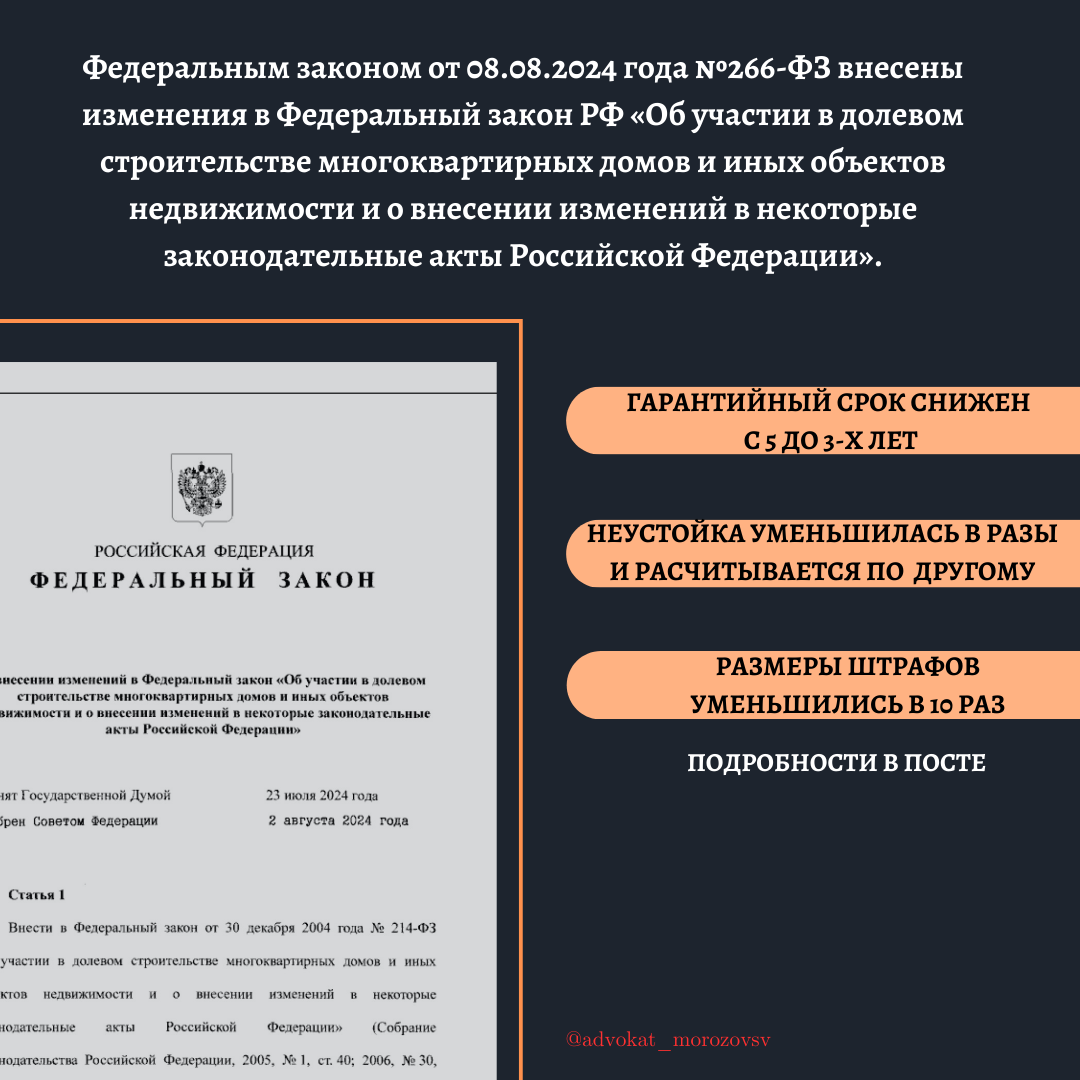 Федеральным законом от 08.08.2024 года №266-ФЗ внесены изменения в Федеральный закон РФ «Об участии в долевом строительстве многоквартирных домов и иных объектов недвижимости и о внесении изменений в некоторые законодательные акты Российской Федерации». Так, внесены изменения в п. 5 ст. 7 данного закона. С 01.09.2024 года минимальный гарантийный срок, который должен устанавливать застройщик, снижен с 5 лет до 3-х. Фактически теперь срок гарантии на конструктивные элементы здания равен гарантийному сроку на инженерное оборудование. 👨💼: Обоснованно ли данное изменение, сказать сложно. С одной стороны унификация сроков облегчила жизнь застройщикам, с другой – вызывает обоснованные опасения у покупателей. Достаточен ли трёхлетний срок для выявления недостатков в конструктиве здания? Второе новшество – изменение расчёта неустойки. Раньше на правоотношения между застройщиком и покупателем распространялись положения Закона РФ «О защите прав потребителей» и размер неустойки составлял 1% в д