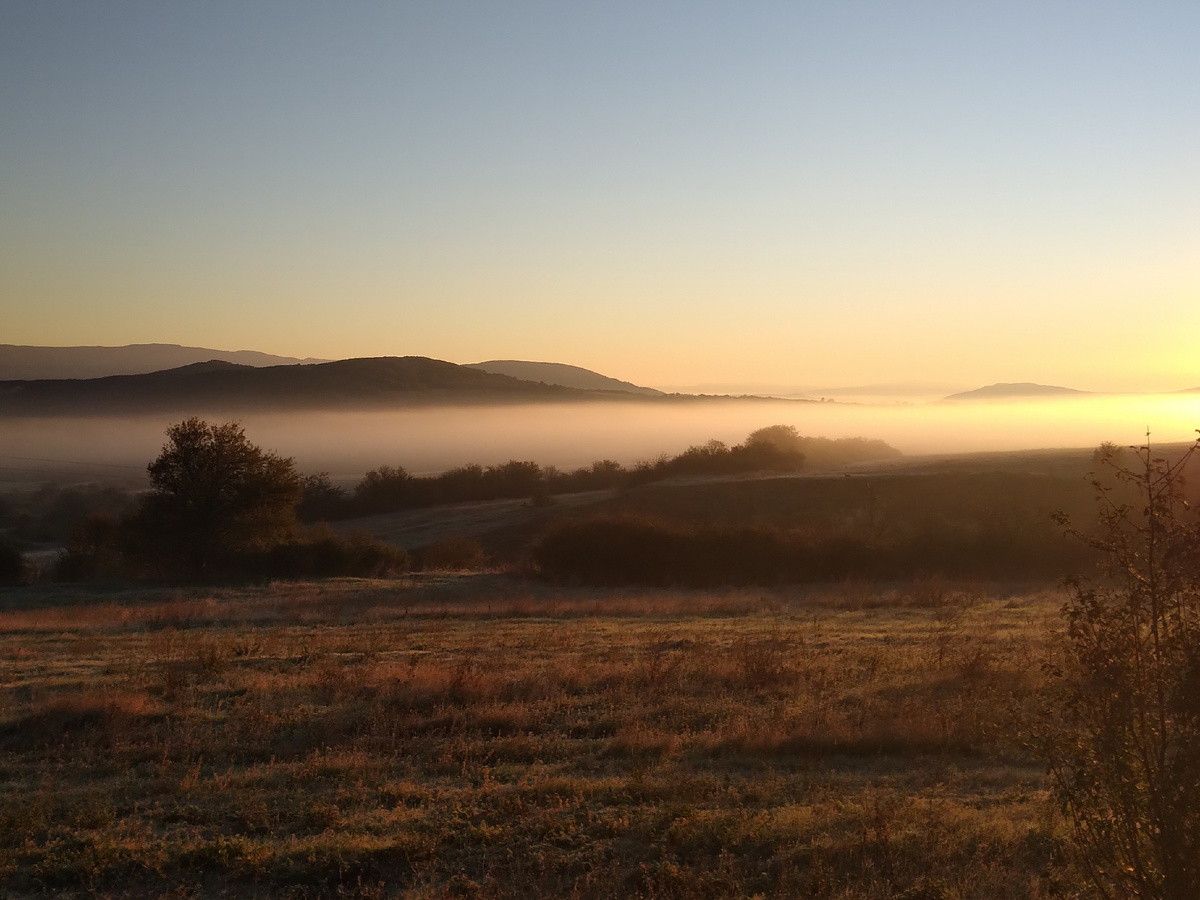 По утрам в долине за селом лежит плотный туман. В лучах восходящего солнца он кажется розовато- жёлтым. С каждым днем светает все позже, а темнеет раньше, и это уже заметно. Так будет продолжаться ещё два месяца, до дня зимнего солнцестояния. В конце этой недели будет переход на зимнее время. Когда темнеет, во дворе начинают слышаться какие- то заунывные вопли. Долго не могла понять, кто там голосит. В конце- концов выяснилось, что так кричит кукумявка- домовой сыч. Эти кукумявки любят селиться в неработающих печных трубах. На летней кухне как раз есть печка, которую мы не топим и , соответственно, кирпичная труба. Не удивлюсь, если кукумявка решила там обосноваться. Собаки, видимо, её не пугают. Последние дни я занималась как раз вопросами отопления, это становится актуальным. Вычистила печку- каминчик, которая стоит у нас в доме. Пришлось снять жестяные трубы, идущие от печки к дымоходу, специальной железной щёткой на длинной ручке убрать изнутри всю сажу. Оказалось, что одно