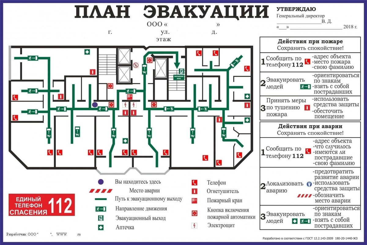 Текстовая часть планов эвакуации должна содержать инструкции о действиях в условиях чрезвычайной ситуации (при пожаре, аварии и т.п.), дополненные для наглядности знаками безопасности и символами.