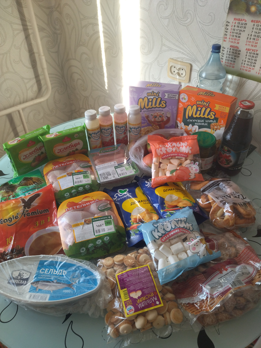 Да-да. Вот только вчера радовалась, что мало за неделю потратила, а сегодня взяла и накупила всякой фигни! Это все муж виноват, это он меня в магазин отправил! Сока велел гранатового купить. Ну я и купила. А к соку все остальное🙈 Вкусняшки детям, кое-что к чаю, селедку взяла - "шубу" давно хочу, мимо шикарной скидки на куриные голени и колбаски для жарки просто не смогла пройти! Голени вышли по 180 рублей за кг, а колбаски по 144. Таких цен в нашем регионе давно уже нет. Поэтому вместо того, чтобы разгружать морозилку, я ее снова забиваю🙈 На самом деле часть того, что куплено, планировала отвезти мужу в больницу, но оказывается, он сок просил домой купить, а мне приезжать не велел из-за затянувшегося дождя, пожалел меня) Так что пока все это лежит дома. Теперь про нашу еду. На завтрак запекла в духовке рулет из тортильи с творогом, сыром и помидорами. На обед куриный суп с вермишелью и компот. К компоту/чаю запекла Творожно-сырные палочки. Они, правда, из палочек немного в пирожки
