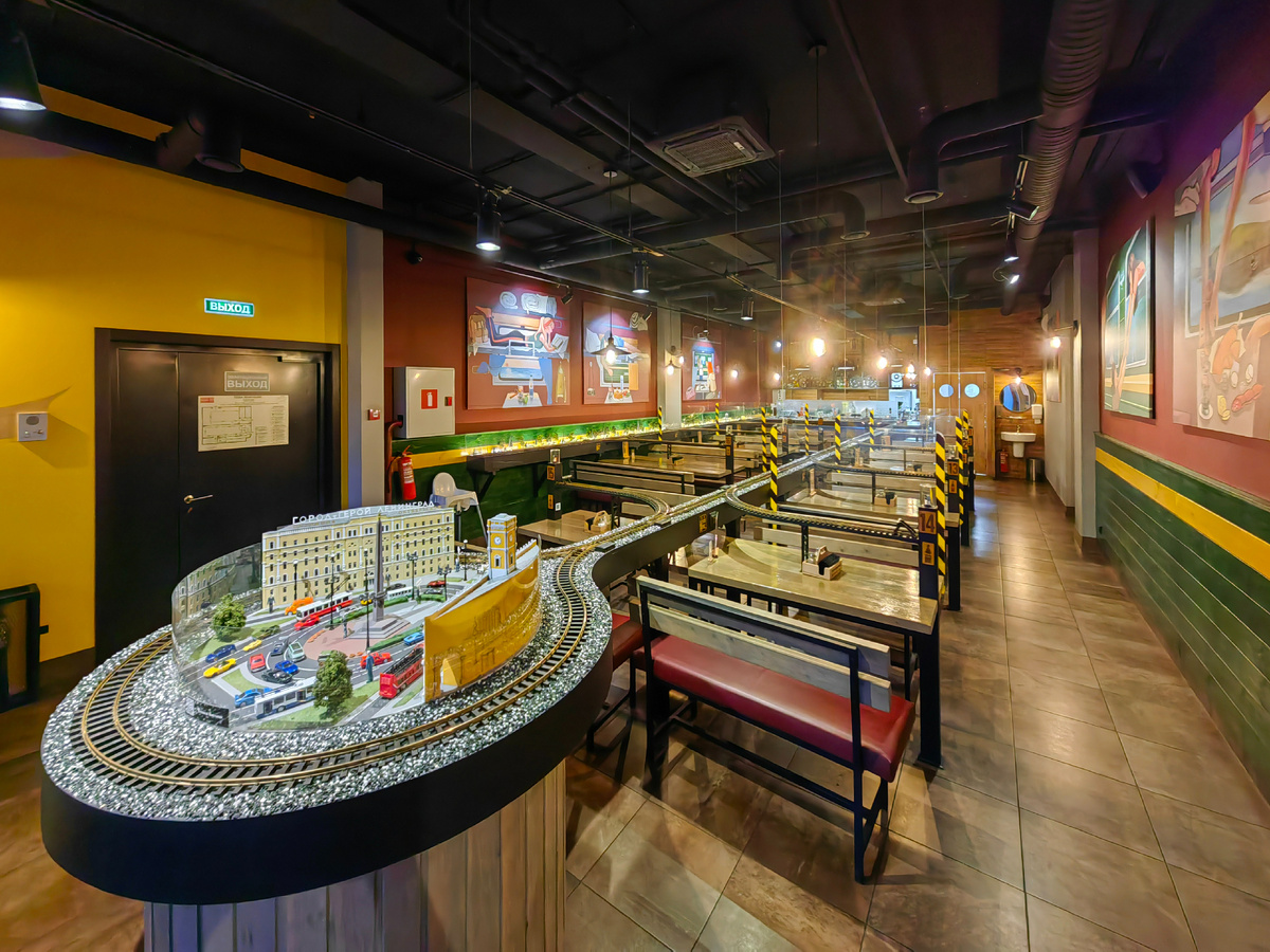 За последний год я посетил уже третье тематическое кафе "Ленинградский экспресс". Два из них находятся в Петербурге. Интерьеры одного я показывал ранее. А ещё одно в Петрозаводске. Кстати, такое же кафе есть и в Мурманске! Теперь и оно у меня в уме! А это безлюдный зал кафе "Ленинградский экспресс" на улице Салова в Северной столице. Не знаю насколько сильно пользуется спросом это место. Но мы были в будний день в районе 17:00 и в помещении вообще никого не было минут 20. Потом, правда, пришли человек 10. Меня "Ленинградский экспресс" привлекает тем, что здесь создан небанальный интерьер на железнодорожную тему. А холодные напитки, десерты и стаканы в подстаканниках для горячего (как в поездах) вам привозит паровоз. Почему бы не совместить приятное (интерактив) с полезным (едой). Из всех столиков лично мне более других понравился номер 18. Во-первых, он находится прямо у выезда поезда из депо. Поэтому состав будет всегда проезжать мимо вас во время других заказов. Плюс рядом с вами нах