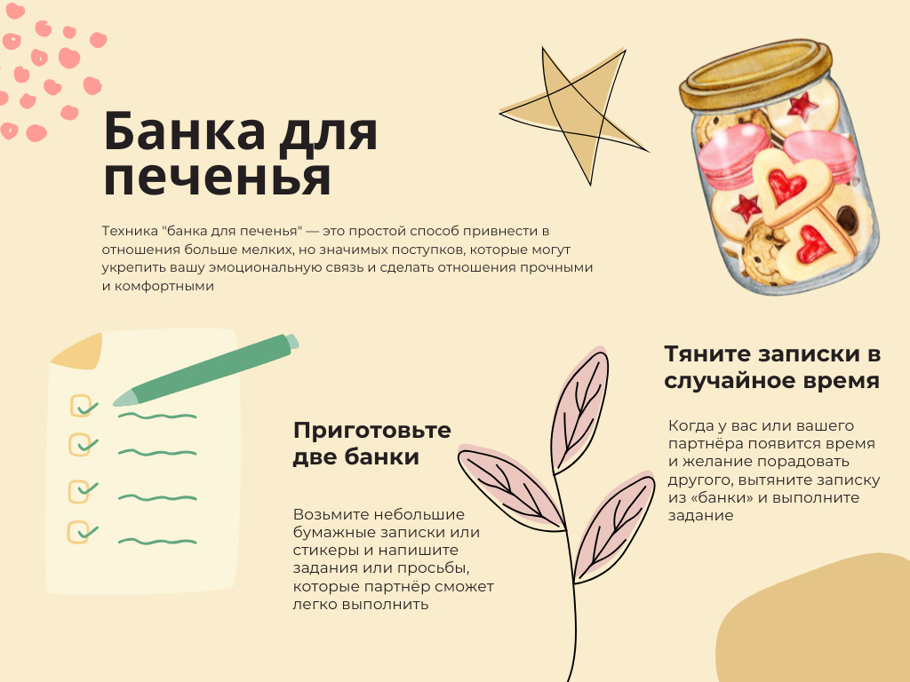 Когда мы слышим о крепких и гармоничных отношениях, часто речь идет о важности спонтанности и искренности в проявлении внимания. Многие думают, что настоящую радость и удовольствие могут принести только те действия, которые сделаны без предварительных договоренностей. "Я не хочу чтобы он дарил мне цветы, когда я его попрошу, он должен сам хотеть это делать, иначе мне не надо" - Знакомо? Но парадокс! Сознательные поступки и новое поведение улучшают отношения и приводят к позитивным изменениям в паре. Давайте проверим? Берите банку для печенья и поехали)