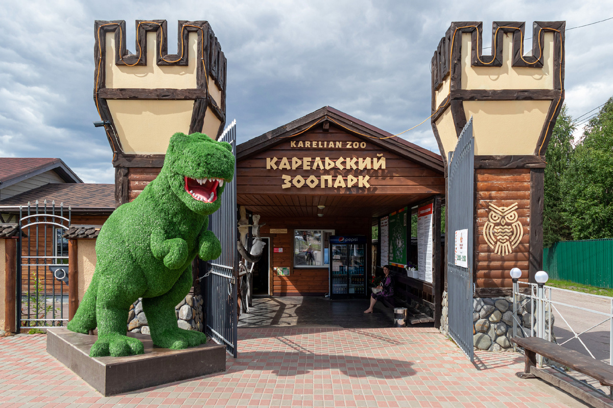 Входная группа. Не понятно, к чему тут динозавр - в зоопарке ни одного динозавра нет )) Тот же лось смотрелся бы уместнее (хотя лосей тоже нет). Перед входом - голубоглазый леший и обширная стоянка. Мы тут были, получается, в воскресенье, и на стоянке было вполне свободно, при том что машин довольно много. Основной способ добр