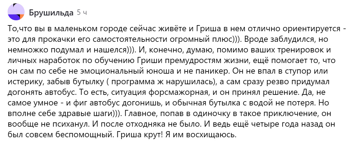 Как очевидно любому адекватному человеку, я пишу о Грише не всё. Не то чтобы скрываю плохое, нет. Точно так же я бы писала про любого другого здорового близкого человека. На мой взгляд, есть некий... такт что ли, который не позволяет описывать человека так, чтобы это унижало его.