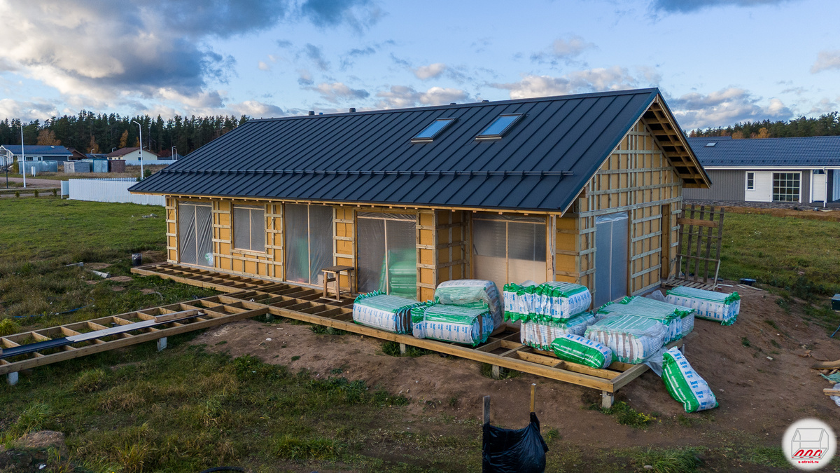 Очередная реализация дома по мотивам популярного проекта Mikea-5 от Оптимум Хаус в каркасном исполнении на утеплённой шведской плите в Приозерском районе Ленинградской области: