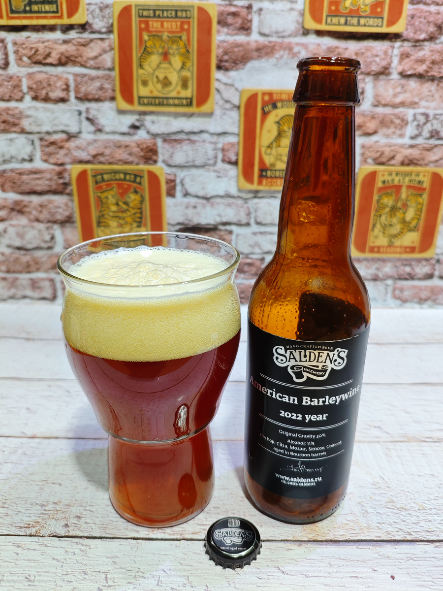 Давненько на канале не было продукции тульской пивоварни Salden's (ООО "Добрый Хмель"). А между тем в недрах моего холодильника затерялась вот такая интересная бутылочка. Надписи на этикетке сообщают, что при приготовлении этого барливайна применялось сухое охмеление американскими хмелями Citra, Mosaic, Simcoe и Chinook. Собственно говоря именно поэтому он и "American". Кроме того напиток был выдержан в бочке из под бурбона. Звучит интересно. ********************************************************************************** На сайте пивоварни как всегда никаких пояснений. На UNTAPPD также глухо; разве что заявлена горечь 70 IBU, но на сколько эта информация правдива - неизвестно. ********************************************************************************** Плотность: 30%. Горечь: 70 (На UNTAPPD). Состав: вода, солод пивоваренный, хмель, дрожжи. Срок годности: 365 суток (12 месяцев) при температуре от +2℃ до +6℃. С даты розлива моей бутылки прошло чуть более 16-ти месяцев. То ес