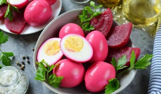 Маринованные яйца со свёклой — это оригинальное блюдо, которое может стать интересной закуской или дополнением к основным блюдам. Яйца, замаринованные в свекольном соке, приобретают нежный розовый цвет и пикантный вкус. Ингредиенты: Приготовление: Яйца отварите вкрутую (10-12 минут после закипания воды), затем остудите их в холодной воде. Свёклу очистите и нарежьте кубиками или натрите на крупной тёрке. Лук нарежьте полукольцами, чеснок измельчите. В кастрюле соедините свёклу, лук, чеснок, воду, уксус, сахар и соль. Доведите смесь до кипения. Остывшие яйца очистите от скорлупы и поместите в кипящий маринад. Варите яйца в маринаде 5 минут. Затем снимите кастрюлю с огня и оставьте яйца в маринаде на несколько часов или на ночь, чтобы они хорошо пропитались. Готовые маринованные яйца со свёклой можно подавать как холодную закуску или добавлять в салаты. Приятного аппетита!