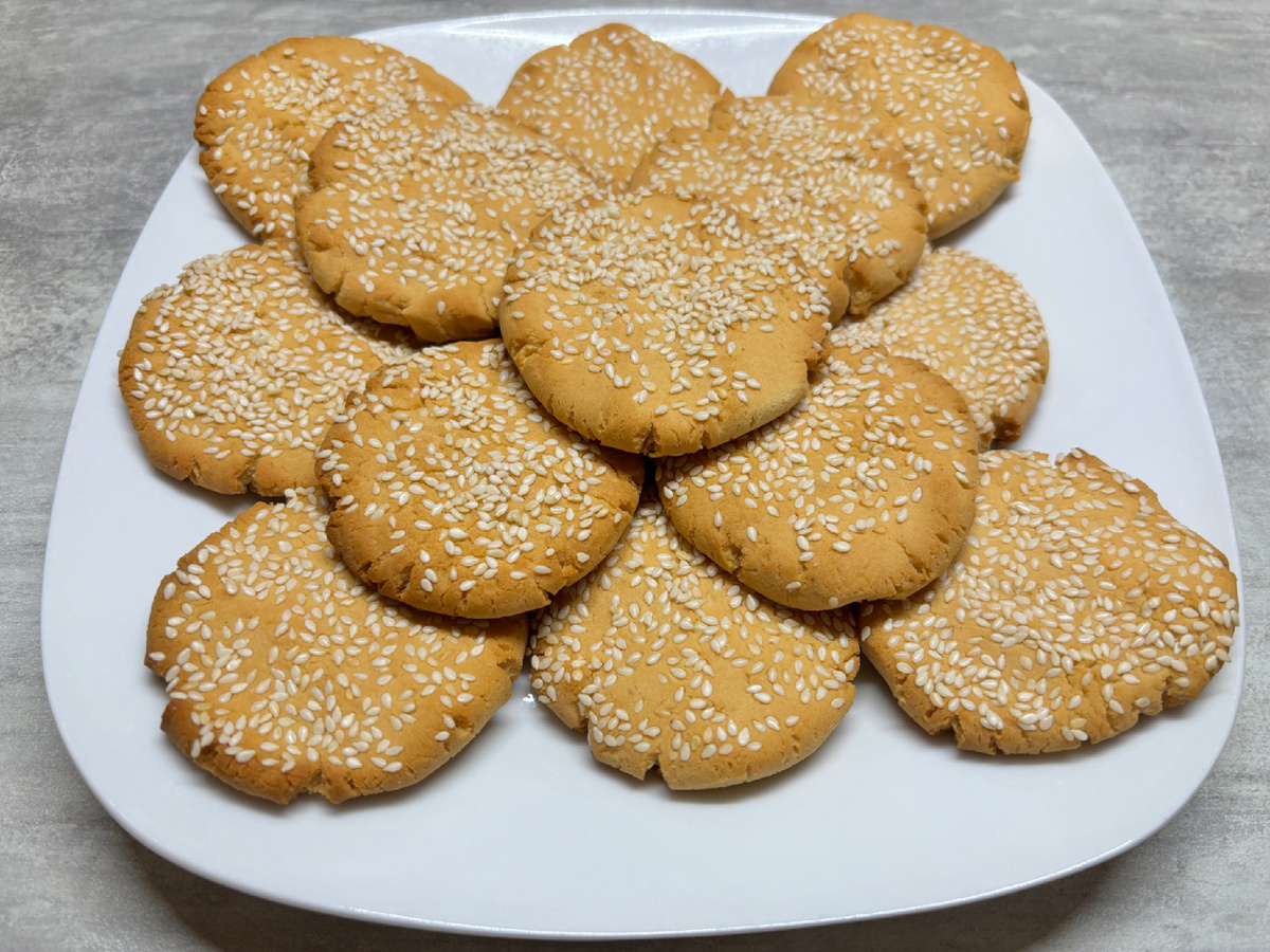Сегодня готовим безглютеновое печенье, можно употреблять тем, кто сидит на ПП (правильное питание). Готовим по рецепту, производителя рисовой муки, "Селяночка" Состав печенья: 300 г. муки рисовой 2 яйца С1 100 г. сливочного масла 100 г. мёда жидкого 0,5 ч.л. разрыхлителя 0,5 ч.л. кардамона молотого 2-3 ч.л. кунжута белого Взбиваем размягчённое сливочное масло с мёдом до состояния однородной массы. Добавляем яйца в смесь сливочного масла с мёдом и всё перемешиваем. Добавляем разрыхлитель, кардамон и рисовую муку. Замешиваем однородное тесто. Вот такое гладкое, однородное тесто у нас получилось. Теперь его надо положить в холодильник на 10 минут. Включаем на разогрев духовой шкаф, температура 190°С. Из теста скатываем шарики по 40 грамм, обмакиваем в кунжуте, укладываем на лист с пергаментной бумагой или на силиконовый коврик, и придавливаем, создавая форму круглого печенья, до толщины примерно 0,6-0,8 см. И ставим лист в духовой шкаф, примерно на 20 минут. Вот такое красивое, золотис