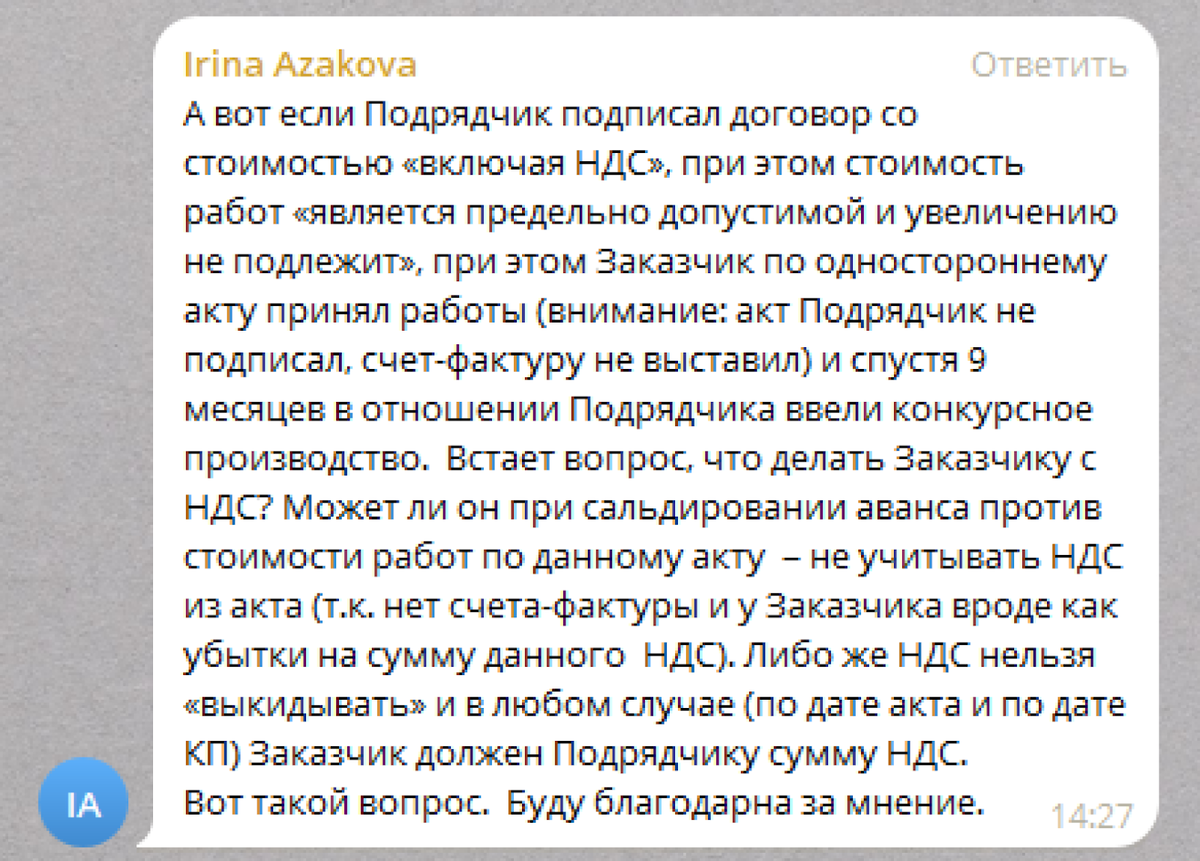 Недавно под заметкой про НДС в договоре подряда появился интересный вопрос. Решили ответить на него отдельной статьей, потому что ситуация может оказаться знакомой для многих. Вот сам вопрос: Проще говоря, в этой ситуации в договоре написали, что стоимость работ включает в себя НДС и не может быть увеличена. Подрядчик выполненные работы не сдал и не предоставил акт и счет-фактуру. Заказчик сам посчитал, сколько работы было сделано, и принял по одностороннему акту. Через девять месяцев подрядчик объявил себя банкротом и находился на завершающем этапе ликвидации. И тогда встал вопрос о сальдиривании. Как правильно посчитать деньги, которые были выплачены заранее? Должен ли заказчик подрядчику НДС из акта? Ответ подготовила Полина Сараева, старший юрист Контрактики: – Прежде рассмотривать вопрос о сальдировании аванса, нужно понять: Как выяснить, была ли реализация? Реализация работ – это возмездная передача права собственности на результат выполненных работ одним лицом другому. Объектом