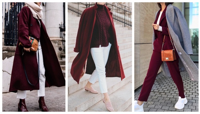 Следующую подборку осенних образов объединяет наличие теплого пальто оверсайз размера винного цвета. Обратите свое внимание, что данный оттенок верхней одежды отлично перекликается с бежевыми, белыми, а также черными деталями гардероба и аксессуарами.