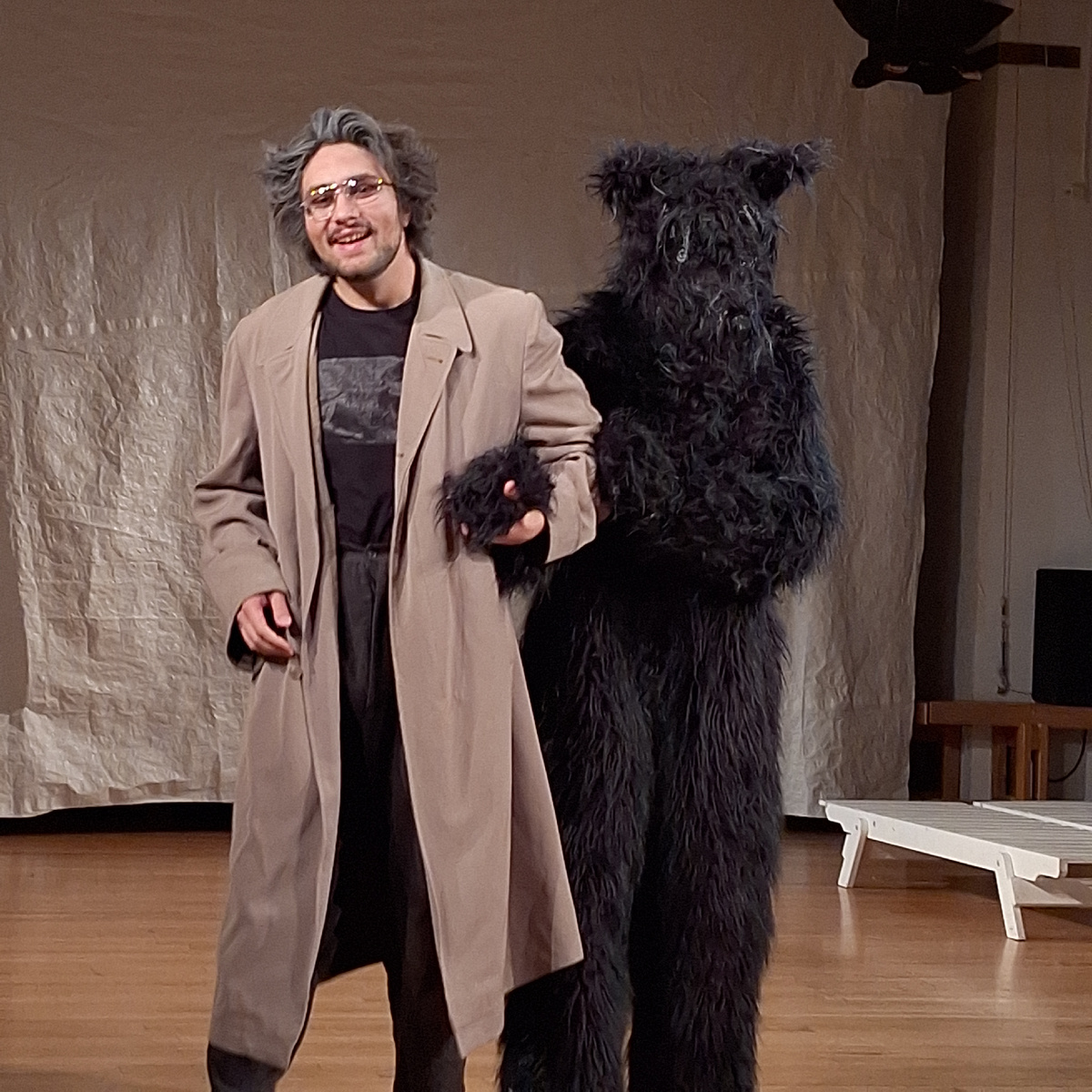 Премьера спектакля "Собака с дамочкой" в Театре «Школа Драматического Искусства» состоялась три года назад и это была дипломная работа студента 5-го курса режиссерского факультета ГИТИСа мастерской Сергея Женовача Гоши Мнацаканова . Если попытаться определить жанр этой постановки, то сделать это непросто, так как в спектакле есть все: американский джаз, ария "Мизерере" креветкам, Каштанка жгет на контрабасе, Гуров великолепно исполняет итальянское диско, доктор Павлов демонстрирует результаты своей работы и т.д. И местами не очень понятно: трагедия это или комедия. Этот спектакль относится к таким, что во время просмотра ты сидишь в состоянии "рука - лицо", а после понимаешь, что глянул бы ещё раз на эту вакханалию))) Несмотря на то, что создатель этого спектакля очень молодой человек ( Гоша Мнацаканов выступает автором идеи, режиссером и композитором), в постановке нет молодежного сленга или шуточек ниже пояса. Только вдохновение чеховской прозой: "Дама с собачкой", "Три сестры"