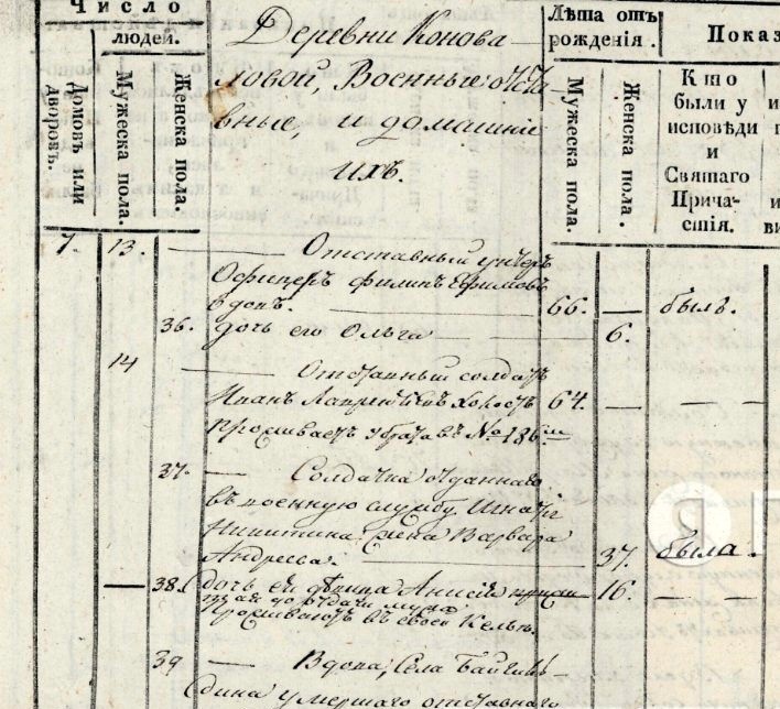 3. Солдатка отданного в военную службу Игната Никитина жена Варвара Андреева – 37