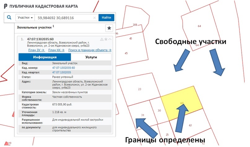 В этом поможет публичная кадастровая карта (или приложение Кадастр.ру). Там содержится информация о свободных участках (без красных границ). Они принадлежат государству (муниципалитету), а не частному лицу.