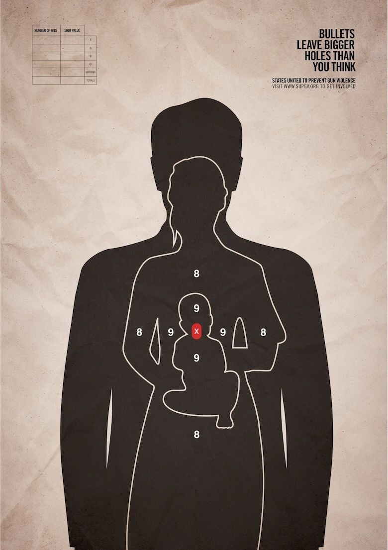Печатная реклама реклама о насилии, с применением огнестрельного оружия под названием «Дыры». На плакате показаны три человеческие цели, в том числе ребёнок. Там также есть послание: