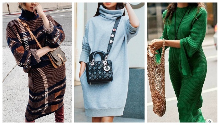В холодное время года трикотажные платья помогают современным дамам сохранить свою женственность и элегантность. Сейчас мы рассмотрим актуальные модели трикотажных платьев, которые помогут вам выглядеть стильно осенью и зимой. Обратите внимание, как хорошо яркие полосы вписываются в это черное платье, подчеркивая фигуру и удлиняя ноги. Это платье лучше сочетать с темными колготками или непрозрачными колготками цвета телесной пудры. С обувью можно также поэкспериментировать, выбирая от лакированных туфель на каблуке до массивных сапог на шнуровке с тракторной подошвой. Этой осенью стоит обратить внимание на цветное трикотажное платье миди с высокой горловиной, которое отлично подчеркивает все изгибы женского тела. Стилисты дополнили данную модель базовыми белыми кроссовками, а также светлым клатчем в минималистичном исполнении. Модели с ярким геометрическим принтом помогут встретить наступающие холода достойно и пестро. Трикотажные изделия данного плана отлично смотрятся к кедами, кросс