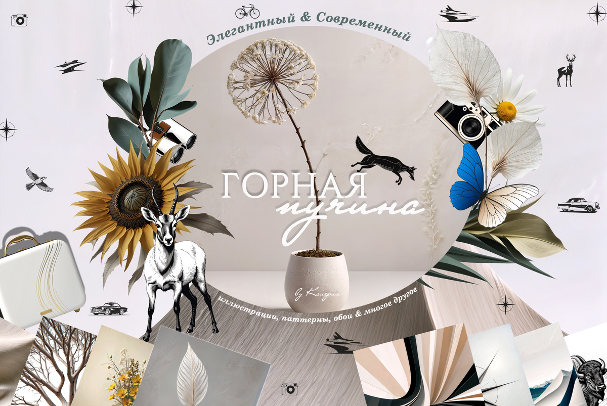Купить можно тут: https://boosty.to/kp_publicit/posts/187e9fc5-a6dc-4f64-bf83-dfa19f080409?share=post_link Откройте для себя мир коллекции "Горная пучина" где встречаются векторные элементы, графические формы, постеры и многое другое. Исследуйте красоту горной природы, откройте для себя необыкновенные детали. Создавайте искусство: дайте волю своему воображению, используя универсальные и очаровательные графические элементы. "Горная пучина" - ваш портал в мир красоты и творчества. Эта коллекция идеально подходит для создания приглашений, постеров, дизайна упаковки, набивки на ткань, дизайна кофеен, ресторанов, и многих других проектов. Сухоцветы добавляют нотку ручной работы, а иллюстрации животных привносят в коллекцию жизнь и индивидуальность. Одной из лучших особенностей этой коллекции является её универсальность. Каждый элемент можно использовать по отдельности, что позволяет вам смешивать и сочетать, чтобы создать индивидуальный дизайн, отвечающий вашим конкретным потребностям. С ра